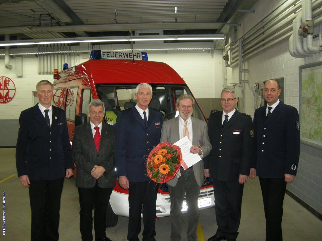 Bernd Schmidt, Leiter des Ordnungs- und Sozialamtes in Heiden und allgemeiner Stellvertreter des Bürgermeisters, ist schon seit Jahren für die Belange der Heidener Wehr verantwortlich und somit unser Mann im Rathaus. über Jahrzehnte hat Bernd sich für das Feuerlösch- und Rettungswesen in der Gemeinde Heiden verdient gemacht. Im April 2012 wird er sich nun aber in den verdienten Ruhestand verabschieden. Johannes Thesing, der über Jahre unser Gemeindebrandmeister war und somit langjähriger Weggefährte von Bernd ist, ließ es sich nicht nehmen ihm stellvertretend für alle Mitglieder der Feuerwehr Dank und Anerkennung auszusprechen.