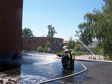 Es wurde angenommen, dass das Dach des neuen Anbaus der Heidener Hauptschule bei Schweißarbeiten in Brand geriet. Ein Trupp rückte mit schwerem Atemschutz und einem C-Rohr auf das Dach vor. Ein weiterer Trupp übernahm die Kühlung eines angrenzenden Gebäudes. Im Rahmen der Löscharbeiten wurde die sich auf dem Dach befindliche Gasflasche gekühlt und anschließend sicher geborgen.