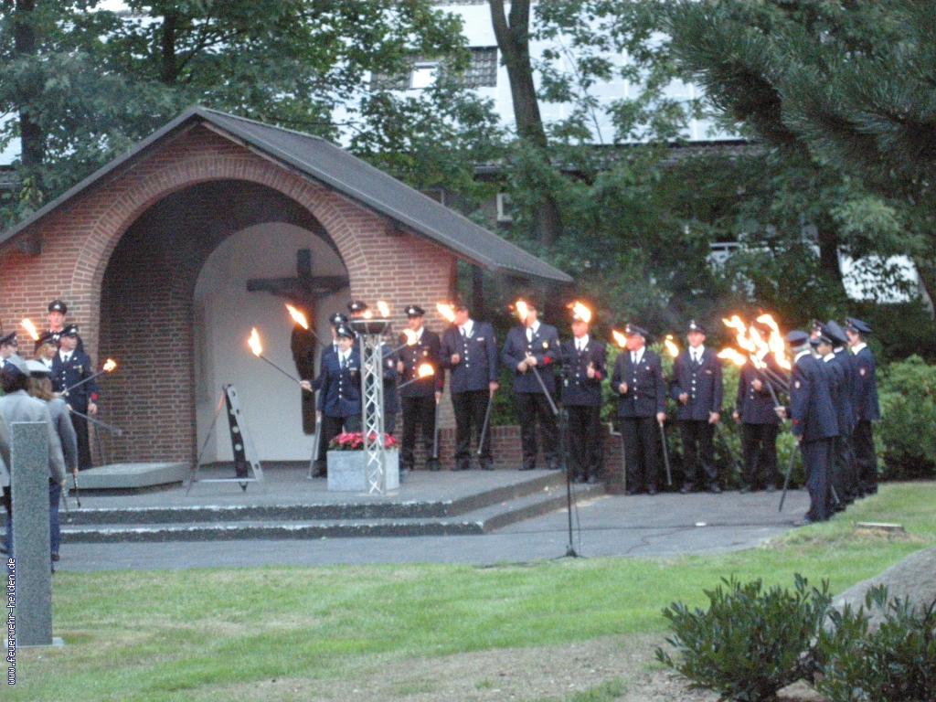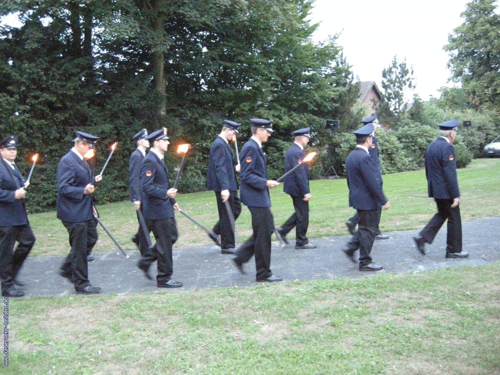 Nach unserem Einzug ins Zelt, marschierten wir zusammen mit dem Spielmannzug und der Musikkapelle zur Kirche, um unsere Fackeln zu entzünden. Nachdem die Fackeln nun entzündet waren gingen wir zum Ehrenmal, um dort an die verstorbenen der beiden Weltkriege und an die verstorbenen Mitglieder des letzten Jahres zu gedenken. Bevor der Zug im Zelt endete spielte der Spielmannzug und die Musikkapelle den Großen Zapfenstreich im Vogelpark.