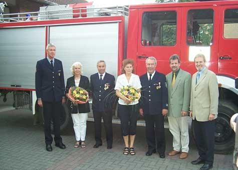 Auf 35 Dienstjahre in der Freiwilligen Feuerwehr Heiden blicken Oberfeuerwehrmann Hermann Klöpper und der stellvertretende Gemeindebrandmeister Paul Fortmann zurück. Für diesen ehrenamtlichen Einsatz für die Gemeinschaft und die Gemeinde hat Bürgermeister Heiner Buß die beiden verdienten Feuerwehrleute jetzt im Beisein der versammelten Feuerwehrkameraden und seines allgemeinen Stellvertreters Bernd Schmidt mit dem Feuerwehr-Ehrenzeichen in Gold ausgezeichnet. In seiner Ansprache skizzierte der Bürgermeister den Werdegang der beiden Geehrten in der Heidener Feuerwehr. Augenzwinkernd wies er auf Hermann Klöppers aktive Teilnahme in der Wettkampfgruppe B beim Feuerwehrwettkampf in Kuopio hin: Als ältestes aktives Mitglied der Wehr zähle der "schnellste Opa auch zu den Heidener Goldjungs". Paul Fortmann, so machte Buß deutlich, habe durch umfangreiche Ausbildungsmaßnahmen den Grundstein dafür gelegt, dass die Feuerwehrkameraden und der Gemeinderat ihn inzwischen zum stellvertretenden Gemeindebrandmeister ernannt hätten. Auch den Ehefrauen der Geehrten zollte der Bürgermeister seine Anerkennung: Sie hätten in all den Jahren viel Verständnis für die ehrenamtliche Tätigkeit ihrer Ehemänner aufgebracht, und oft auch selbst bei Wettkämpfen oder Vereinsveranstaltungen mit Hand angelegt.