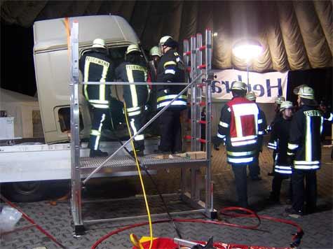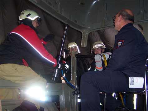 Weiterhin wurden den Teilnehmer neue Techniken aus der Automobilindustrie in Punkto Fahrzeugsicherheit aufgezeigt. Als Highlight hatten die Veranstalter ein LKW-Führerhaus organisiert, an dem die Feuerwehrmänner praktisch Schere und Spreizer zum Einsatz bringen konnten.