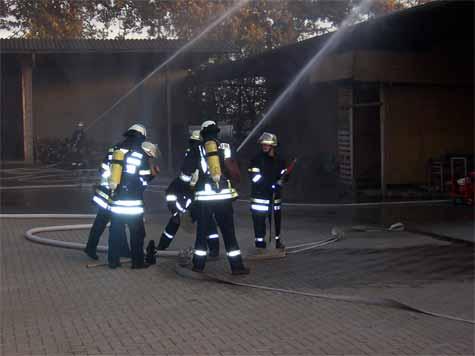 Während der vermisste Arbeiter in Sicherheit gebracht wurde, wurden auch die Gasflaschen von weiteren Trupps ins Freie gebracht um sie dort zu kühlen. Weiterhin galt es zwei 4000L-Flüssiggastanks im Außenbereich der brennenden Halle zu kühlen, um eine Explosion zu verhindern. In einem eigenen Abschnitt übernahmen die Rekener Kameraden die weitere Brandbekämpfung und den Schutz von noch nicht beschädigten Gebäudeteilen. Außerdem wurde eine Wasserentnahmestelle am nahe gelegenen Löschteich eingerichtet.