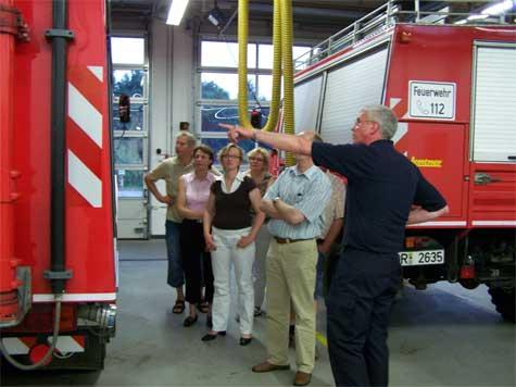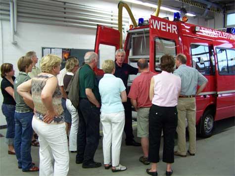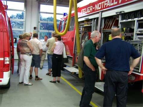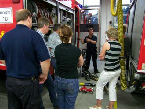 Johannes Thesing begrüßte unsere Besucher und informierte sie zunächst anhand einer PowerPoint Präsentation, über Themengebiete wie z.B. Ausbildung, Personalstand oder Einsatzbereiche. Daraufhin wurde das Erdgeschoß besichtigt, was die Einsatzumkleide oder auch die Einsatzzentrale beinhaltete. Natürlich wurden die Einsatzfahrzeuge genauer ins Visier genommen und auch im Detail von den Kameraden erklärt.