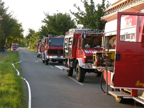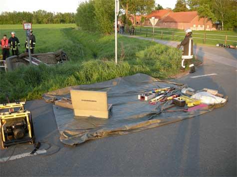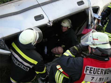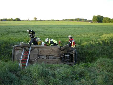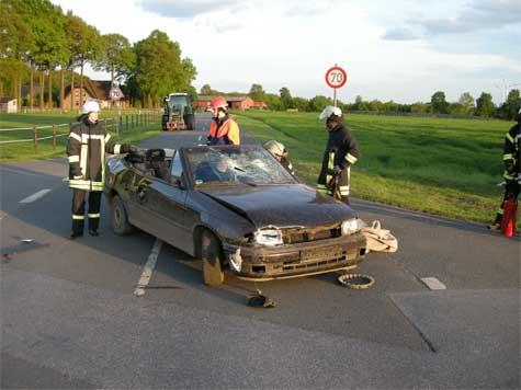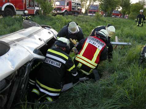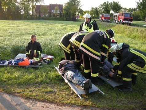 Um die Fortbildungsmaßnahmen im Ganzen zur Anwendung zu bringen, ist eine realitätsnahe Übung an der Leblicher Straße, in Höhe der Zufahrt „Buschhausen“, durchgeführt worden. Hierbei wurde eine Kollision zweier KFZ im Kreuzungsbereich dargestellt, wobei sich ein KFZ auf der Kreuzung stehend befand und eine Person darin leichtverletzt eingeschlossen war. Das andere KFZ war kollisionsbedingt in den Graben geschleudert worden und kam hier auf der Fahrerseite zum Liegen. Dieses erschwerte die Rettung des als schwerverletzt angenommenen Fahrers erheblich, sodass in diesem Fall viel Improvisationstalent von den Einsatzkräften gefordert war. Zusätzlich ist hier noch eine aus dem Fahrzeug heraus geschleuderte Person in das Übungsszenario eingebaut worden, die schwerverletzt in einigem Abstand im kniehohen Gras lag. Weiterhin galt es, einen Unfallzeugen, der sich noch auf seinem Trecker im angestauten Verkehr befand, als psychisch Betroffenen zu erkennen und zu betreuen. Nicht zuletzt wurden alle anderen einsatzrelevanten Dinge, wie z.B. Verkehrsabsicherung etc. ebenfalls in Augenschein genommen, um Handlungsabläufe weiter zu optimieren.