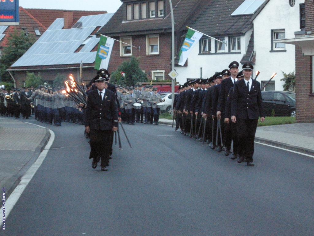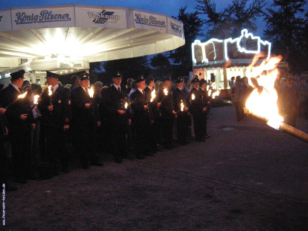 Nach unserem Einzug ins Zelt, marschierten wir zusammen mit dem Spielmannzug und der Musikkapelle zur Kirche, um unsere Fackeln zu entzünden. Nachdem die Fackeln nun entzündet waren gingen wir zum Ehrenmal, um dort an die verstorbenen der beiden Weltkriege und an die verstorbenen Mitglieder des letzten Jahres zu gedenken. Bevor der Zug im Zelt endete spielte der Spielmannzug und die Musikkapelle den Großen Zapfenstreich im Vogelpark.