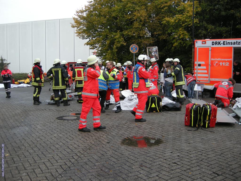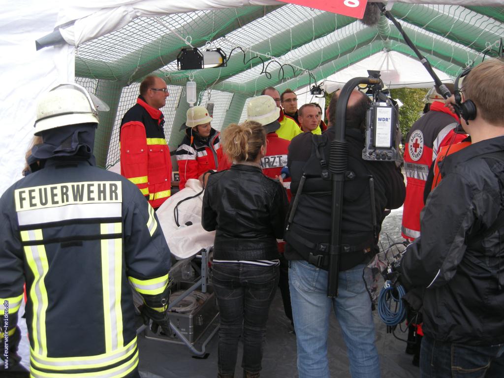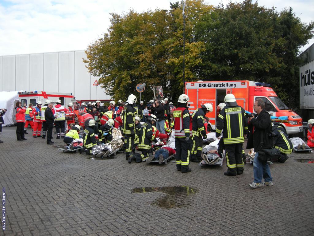 Am frühen Morgen des 29.09.12 versammelten sich ca. 280 Einsatzkräfte von Feuerwehr, Deutschem Roten Kreuz und dem Malteser Hilfsdienst, um eine Großübung auf dem Gelände der Hülsta Werke abzuhalten. Ein Team um Kreisbrandmeister Johannes Thesing und den Brandmeistern Dieter Wanders und Gerd Funke hatten eine umfangreiche Lage vorbereitet, um den kreisweiten Einsatz von Rettungsmitteln bei einem sogenannten Massenanfall von Verletzten (MANV) zu proben. Im Vordergrund stand dabei die Koordinierungsarbeit der jeweiligen Führungskräfte. Wir waren mit unserem Einsatzleitwagen vor Ort, um den Übungseinsatz mit zu koordinieren.