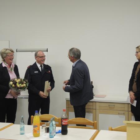 Zunächst wurde Heiner Naßmacher für seine 35-jährige Dienstzeit bei der Freiwilligen Feuerwehr mit dem Feuerwehr-Ehrenzeichen in Gold ausgezeichnet. In seiner Dankesrede hob Carsten Lohaus sein großes Engagement über die gesamten Jahre hinweg hervor. Aber auch Heiners Frau Angelika dankte Carsten für ihre Unterstützung und überreichte ihr einen Blumenstrauß.