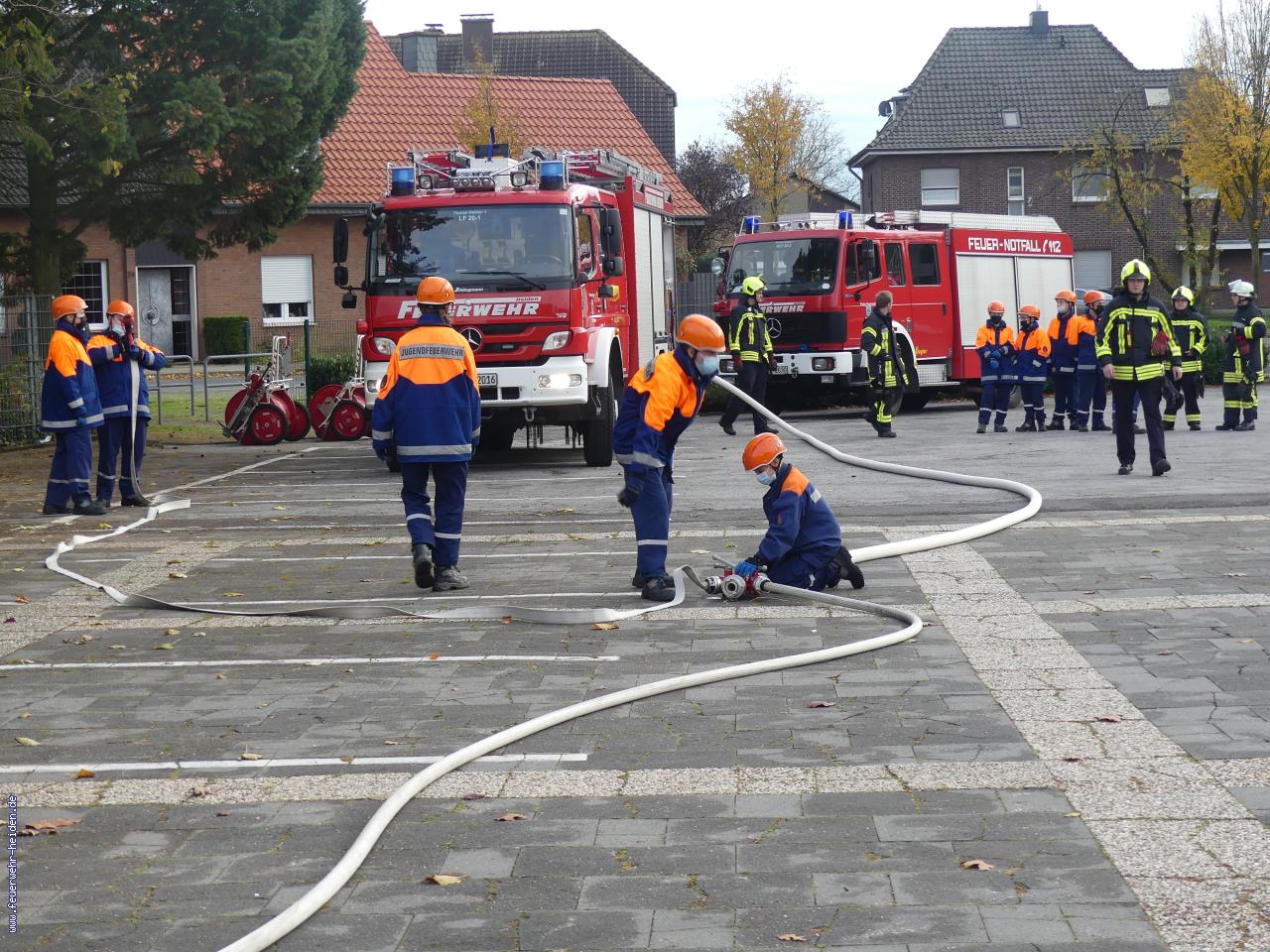 Nach der Begrüßung erfolgte eine kurze Theorieeinheit zur Brand- und Löschlehre. Danach konnte das Wissen auf dem Gelände des Klärwerks der Gemeinde Heiden in die Praxis umgesetzt werden. Auf einer geeigneten Fläche konnte der Umgang mit verschiedenen Feuerlöschern sowie dem Schaumrohr trainiert werden. Vor dem Mittagessen wurden zudem die Handgriffe für Knoten und Stiche weiter gefestigt. Im weiteren Tagesverlauf standen teambildende Übungen während des Dienstsports sowie Übungen zur technischen Hilfeleistung und Brandbekämpfung auf dem Programm. Nach dem Abendessen erfolgte eine kurze Einheit zum Sprechfunk sowie die Demonstration einer Fettexplosion. Den Abschluss bildete eine Nachtwanderung im Wald.